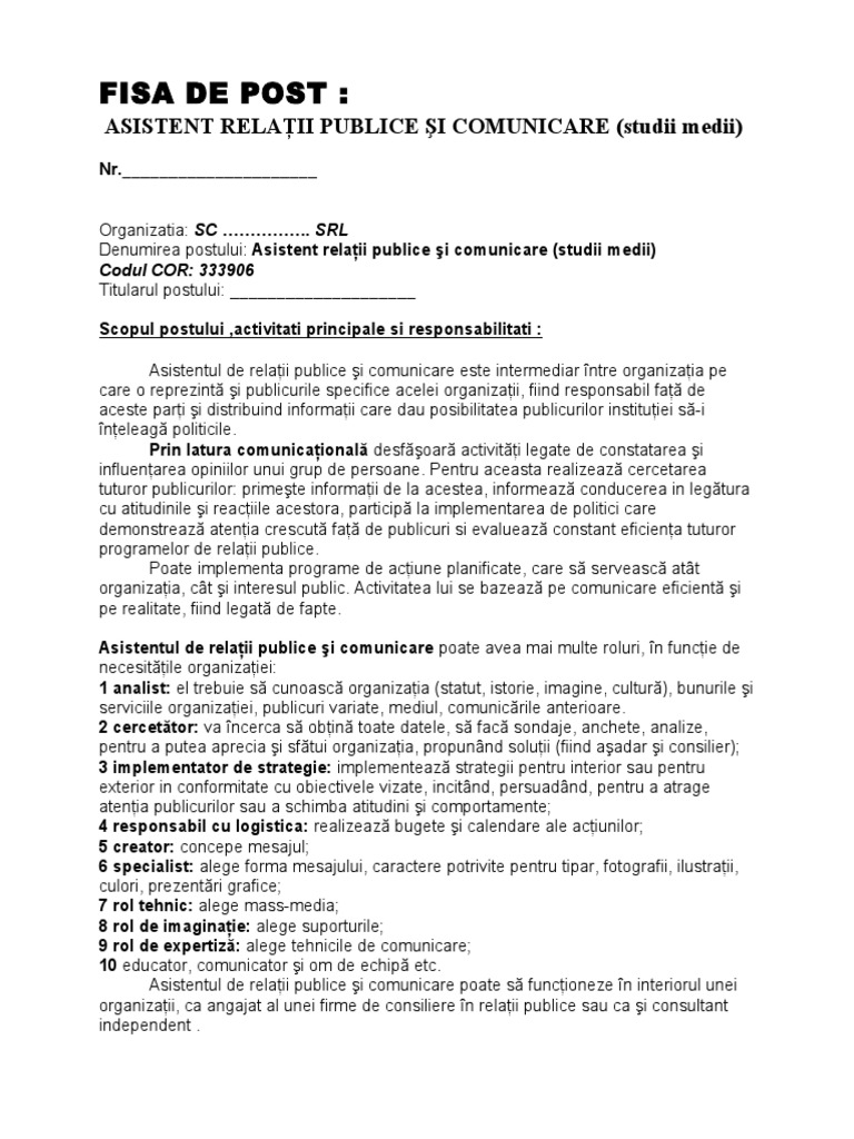 Asistent In Relatii Publice Si Comunicare Fisa Postului