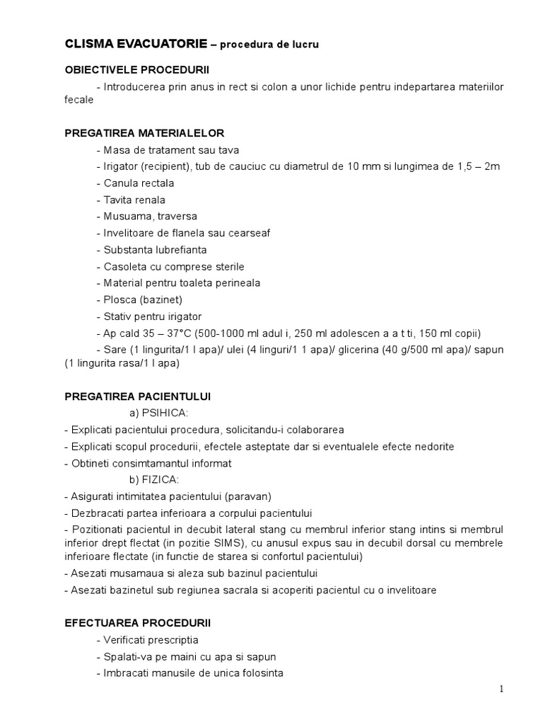 Clisma Evacuatorie Procedura De Lucru Obiectivele Procedurii