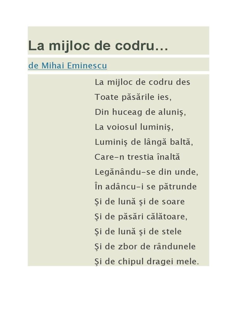 La mijloc de codru de mihai eminescu. La mijloc de codru des toate păsările ies din huceag de aluniş la voiosul luminiş luminiş de lângă baltă care n trestia înaltă legănându se din unde în adâncu i se pătrunde şi de lună şi de soare şi de păsări călătoare şi de lună şi de stele şi de zbor de rândurele şi de chipul dragei mele. La mijloc de codru de mihai eminescu poezie 1883 la mijloc de codru des toate păsările ies din huceag de aluniş la voiosul luminiş luminiş de lângă baltă care n trestia înaltă legănându se din unde în adâncu i se pătrunde şi de lună şi de soare şi de păsări. La mijloc de codru des toate păsările ies din huceag de aluniş la voiosul luminiş luminiş de lângă baltă care n trestia înaltă legănându se din unde în adâncu i se pătrunde şi de lună şi de soare şi de păsări călătoare şi de lună şi de stele şi de zbor de rândurele şi de chipul dragei mele. La mijloc de codru.