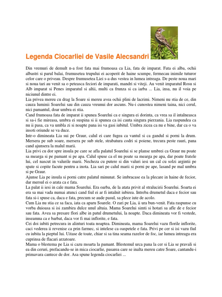 Eve Legenda Ciocarliei De Vasile Alecsandri Din Vremuri Facebook