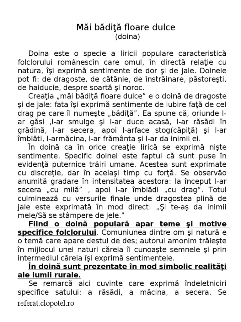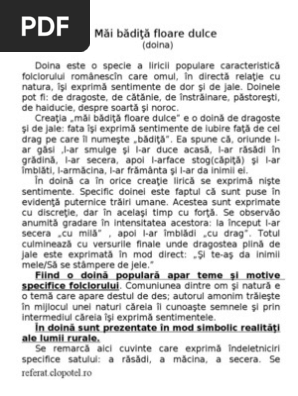 şi te aş măcina mărunt la morişca de argint. Comentariu mai badita floare dulce pentru liceu. Măi bădiţă floare dulce unde te aş găsi te aş smulge şi acasă la noi te aş duce şi te aş răsădi n grădină şi te aş secera cu milă. In cazul in care nu gasiti referatul plan argumentare la doina mai badita floare dulce va rugam sa efectuati o cautare dupa un singur cuvant cheie.