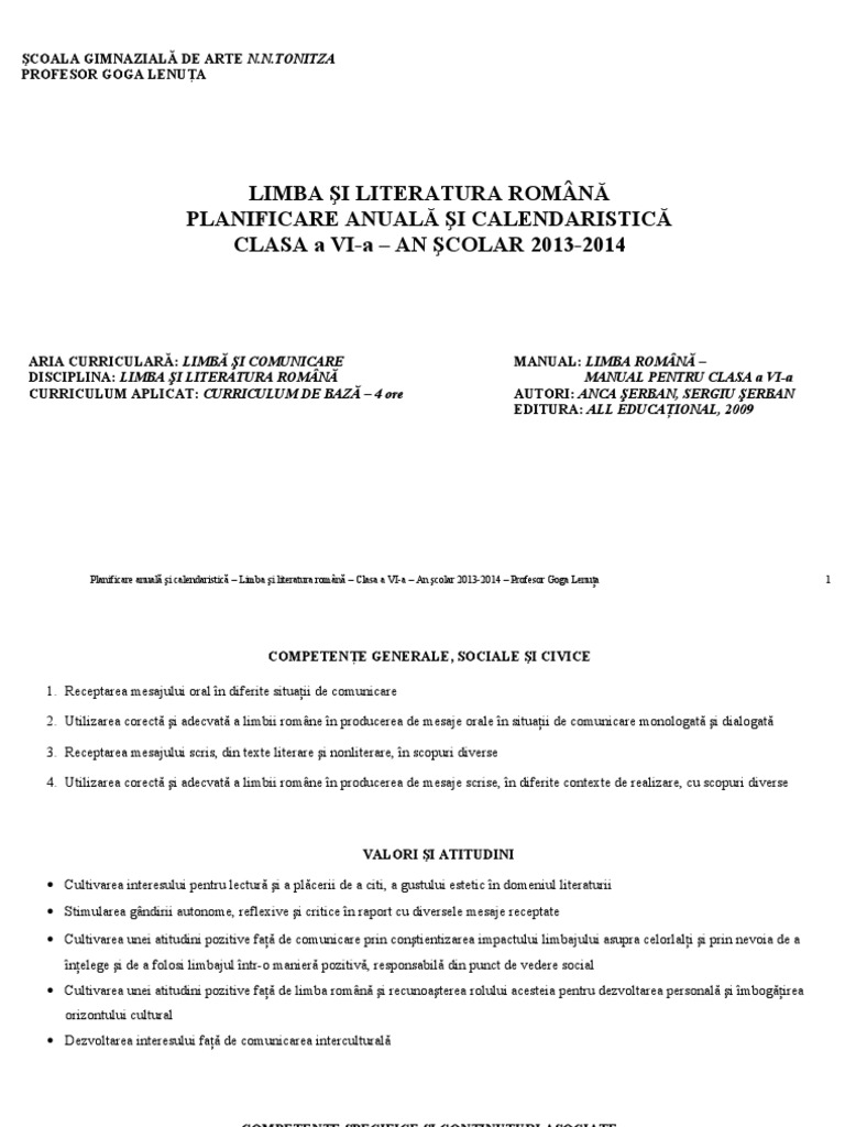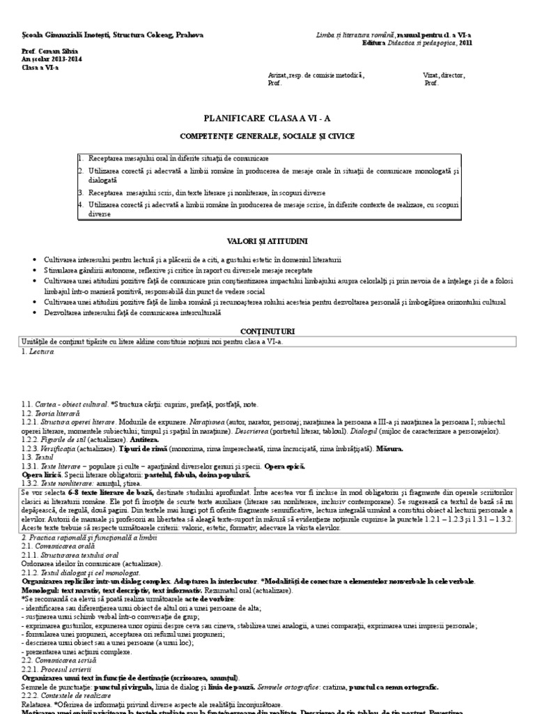 Planificare Limba Romana Clasa A Vi A Editura All